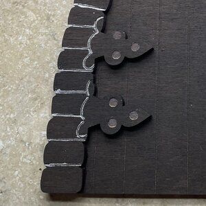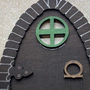 Dark 3mm basswood is laser-cut into an elongated half-oval fairy door. The door has a laser engraved door frame laser-cut into a matching dark stain stone pattern with hinges. The frame and hinges are accented in silver. The door is laser engraved with vertical lines with a round window in a green overlay divided into quarters. A raised door handle is on the right side. The door is 35.5" x 4.5" in size. A metal picture hanger is on the back and the door is sealed with several coats of polyurethane.