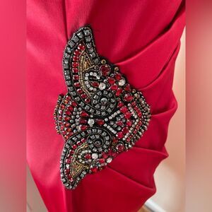 Dark red one shoulder dress with rhinestone waist embellishment