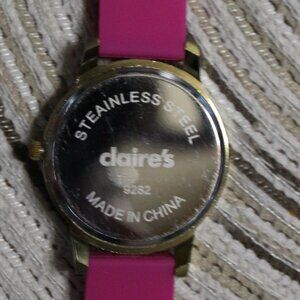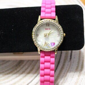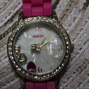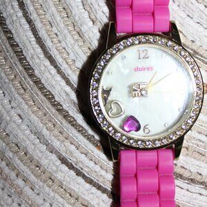 I am cleaning out my jewelry. This is in Like New condition. I wore it one time. It is a pretty Bright pink color, light in weight, stainless steel, bling around the watch face, the clock hands have the word "Love on it " The O in love has a bling stone. It has shaky moving stones on the inside as well. There is a bright pink heart, a gold heart and the Eiffel tower. has a second hand. I just put a brand-new battery in it. That cost me $10. Comes from a smoke free home. Has been stored very safely in watch box. From a smoke free home. This is so cute and fun. No scratch on crystal face.