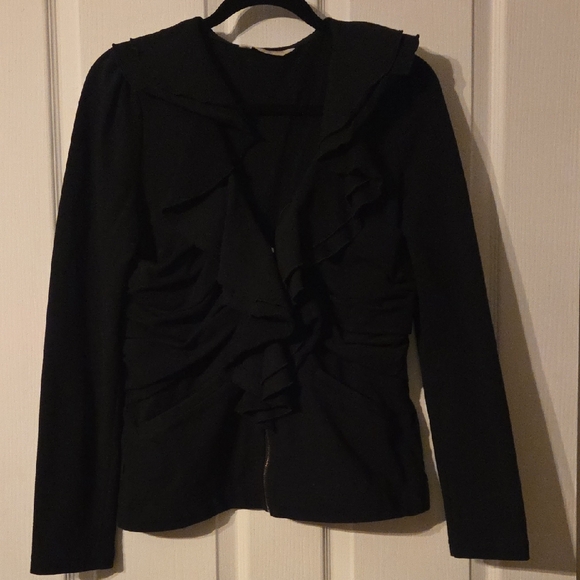 Darling double ruffle jacket with side rushing. So different and unique. Very Flattering with side rushing. ZIp to a deep v neck that adds a little something.