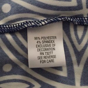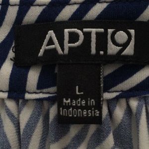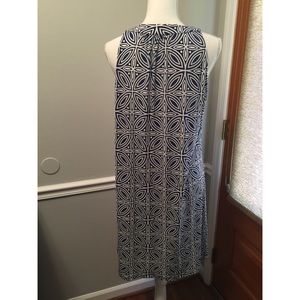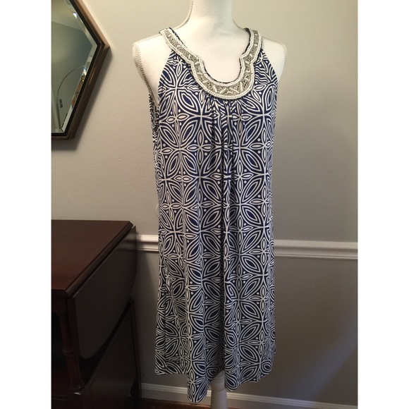 Cool summer dress in a pretty dark blue and white print with a silver and white beaded collar. Apt 9, New without Tags, Size Large, 20” across chest