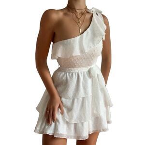 bridal party dress, bachelorette outfit, Taylor Swift inspired look, Sabrina Carpenter style, concert fashion, music festival attire, graduation dress, beach party wear, brunch outfit ideas, tea party dress, one-shoulder dress, ruffle dress, mini dress, white dress, chic summer dress, day party dress, stylish spring wear, trendy women’s clothing, special occasion dress, cute and trendy dresses, party-ready outfits, fashionista favorites, engagement party dress, celebratory attire, summer trends, fashion-forward styling, elegant mini dress, romantic dress style, contemporary women’s fashion, date night dress