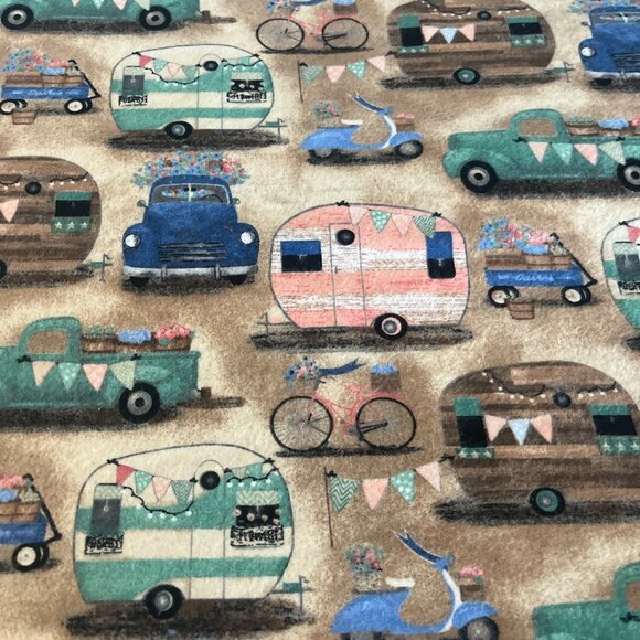 Fabric has CAMPERS, ANTIQUE PICK-UPS. WAGONS, SCOOTERS & BICYCLES on a SOFT CREAM & BROWN background.