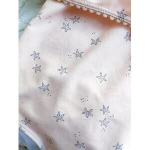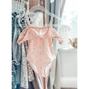 Precious little starfish print. Fluttery flounce top. Peekaboo cold Shoulder straps. Muted peach color.