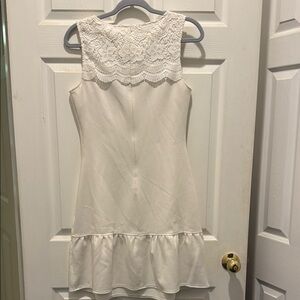 This stunning white sundress by Darling features a sleeveless design with a crew neck, perfect for a bride or cocktail event. The dress showcases a ruffled hem that adds a playful touch to its elegant silhouette, making it a standout choice for any special occasion.