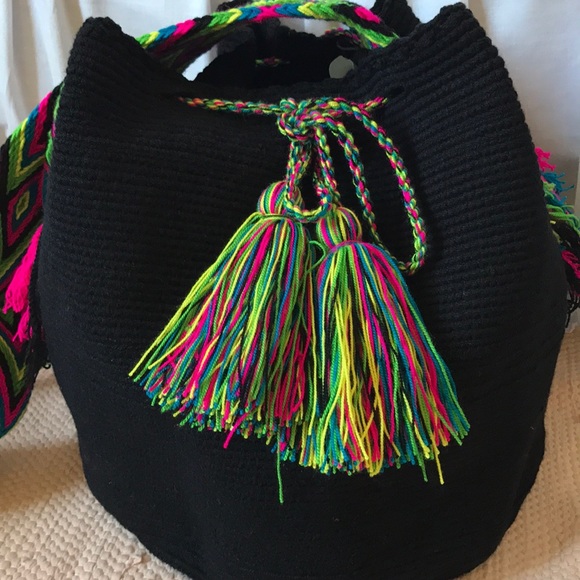 Awesome authentic Colombian mochila. Bucket style satchel. Tightly woven cotton for great durability. Handmade by Wayuu Indians and takes 24 days to weave a bag! Approx 10x11". Strap 18" NWOT