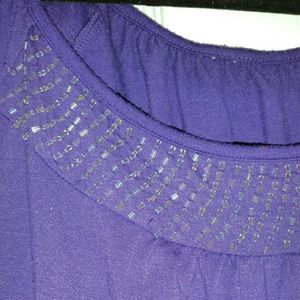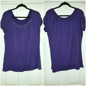 This shirt is the perfect pop of color! Short sleeved, cotton shirt with shimmery beads around the neck line. Fits true to size