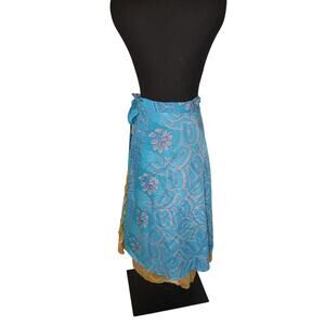 Add a touch of bohemian flair to your wardrobe with this stunning Darn Good Yard Sari Silk Wrap Skirt! This ankle-length skirt features a beautiful blend of turquoise and gold colors, perfect for adding a pop of color to any outfit. The adjustable wrap design fits sizes 4-12, making it a versatile addition to your closet. Made from repurposed sari silk, each skirt is unique and eco-friendly. Embrace sustainable fashion with this vibrant and eye-catching skirt! Get ready to turn heads and feel fabulous!