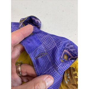 The Darn Good Yarn Reversible Sari Wrap Skirt in mini size 4-12 is a vibrant and stylish piece perfect for casual occasions in the summer season. This bohemian skirt features a geometric pattern in shades of purple and gold, made from luxurious silk chiffon fabric imported from India. The tie closure and layered accents add a unique touch to this reversible wrap skirt, making it a versatile and eye-catching addition to any woman's wardrobe.