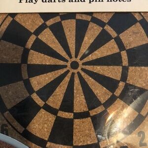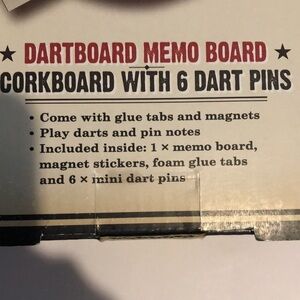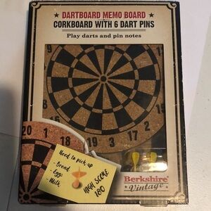 Miniature Dartboard memo board, cork. Comes with 6 darts, magnetic stickers, foam glue pads, pin sticks . Made by Birkshire. Makes a cute gift . New in box