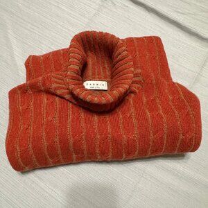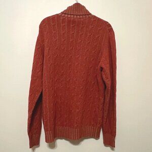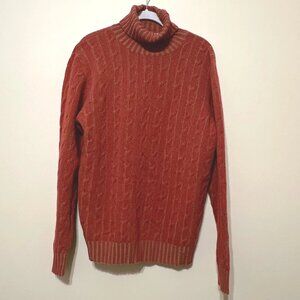 Elevated style arrives in this handsome cable-knit turtleneck sweater, a testament to timeless design and cozy comfort. The intricate 100% Italian wool cable knit pattern adds depth and texture, creating a visually appealing piece that stands out. The warm, earthy tone evokes a sense of rustic charm, while the ribbed turtleneck, cuffs, and hem provide a snug and refined fit. Imagine wearing this sweater on a crisp autumn day, strolling through a park with colorful foliage, or enjoying a fireside chat in a cozy cabin. It's also perfect for a sophisticated yet relaxed evening out, paired with dark denim or chinos.