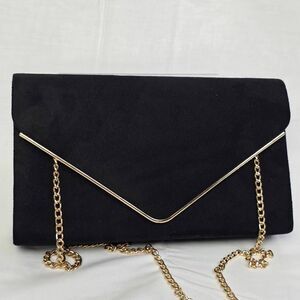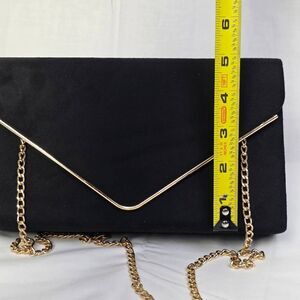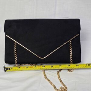Elegant Dasein black faux suede clutch purse with gold V-trim and removable chain strap. Perfect for weddings, formal events, or nights out.
