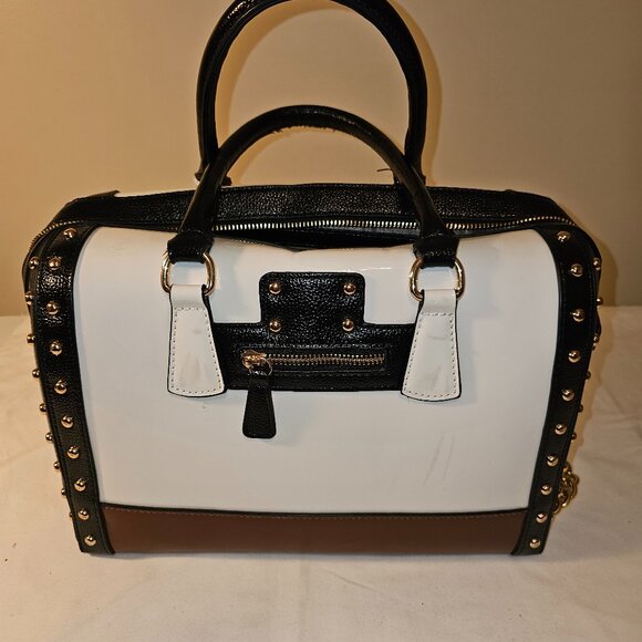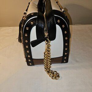 Fantastic patent leather shiny mailbox shaped large free-standing purse. This purse is white and has black handles and trim with gold studs and a complementary brown bottom. Zipper top with chain. Main compartment has slip in and a zippered pocket. Front of the handbag has a zipper accent. 10H x 14W