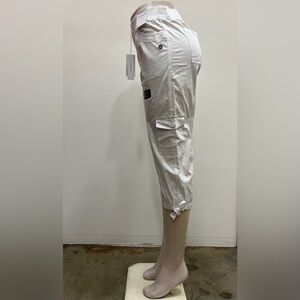 Dash cotton pull on elastic waist front and back pockets belt loops Capri with side cargo pocket.