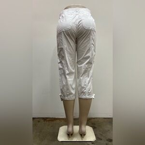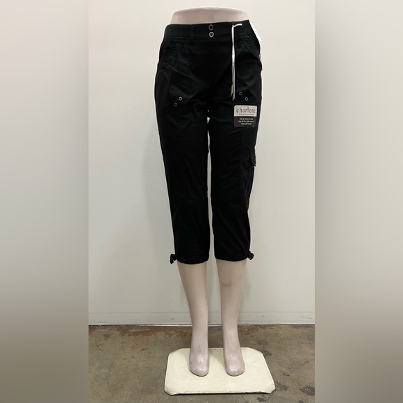 Dash cotton pull on elastic waist front and back pockets belt loops Capri with cargo pocket and leg tie.