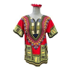 Dashikis make an authentic African addition to any wardrobe. The traditional dashikis have a small V-neckline, short sleeves, and an unconstructed bodice sometimes with front pockets. This dashiki has front front pockets.