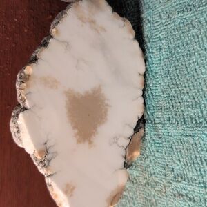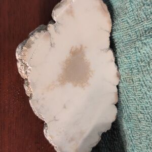 Datolite#1. This was one piece that has been cut into two halves. This is rough-cut and unpolished. There are saw marks. This has been pictured wet and dry. These look best when wet, clear coated, or polished approx 5" X 3.25".