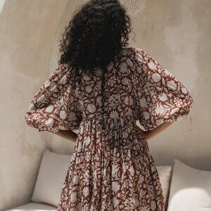 The beauty of block print is stunning on this everyday mini dress. A flattering feminine design featuring optional tie detailing on the neckline, romantic billowing sleeves and a full bodied skirt free of underlining, making it the most comfortable style due to the heavenly soft lightness of the material.
