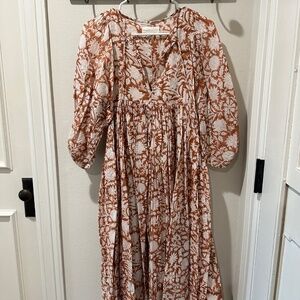The Daughters of India signature Kyra design in an earthy brown tone. The everyday Kyra dress features romantic billowing sleeves and optional front tie detailing while the full bodied skirt is free of underlining, making it one of our most comfortable styles due to the magical lightness of the material. Our signature floral pattern feels uplifting and vibrant on this maternity and breast feeding friendly design.