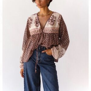 -has blouson sleeves with an elasticated cuff, a front tie and loose fitting bodice that can be worn freely or tucked into the waist for a more tailored look.