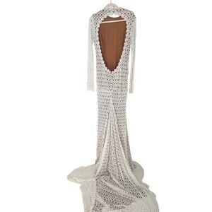 Stunning Daughters of Simone Hollis lace wedding gown in size XL, a sought-after bohemian bridal style known for its timeless romance and effortless elegance. This full-length ivory crochet lace gown features a high neckline, long fitted sleeves, and a dramatic open back framed by intricate scalloped lace. The figure-skimming silhouette flows into a soft lace train, making it perfect for modern brides, elopements, outdoor ceremonies, or vintage-inspired weddings.