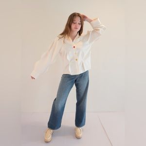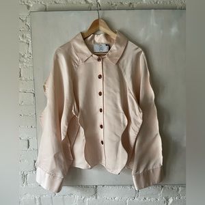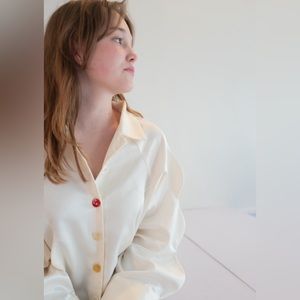 Crafted from 100% Silk. This structured silk-blend top features petal-inspired Scalloped sleeves and seems. A nontraditional take on the classic button up shirt, with vintage buttons. No two shirts are alike.