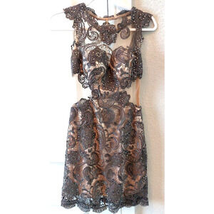 Step into the spotlight with this stunning Dave & Johnny Embroidered Rhinestone Illusion Cocktail Dress. The dress features a flattering fit and flare design with a bodycon silhouette that will hug your curves in all the right places. The cap sleeves and round neckline add a touch of elegance, while the side zip closure ensures a secure and comfortable fit. Made from high-quality polyester material, this dress is perfect for any occasion, from parties to cocktail events. The gunmetal silver color and illusion see through pattern add a touch of royalty to the dress, making it perfect for a princess or elegant prom theme. The dress is available in size 0 and is suitable for juniors. Make a statement with this gorgeous dress from Dave & Johnny. Retails for $250.