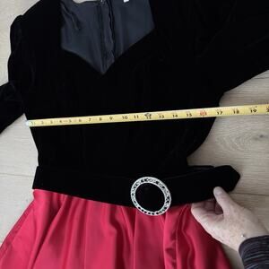 Dave and Johnny Vintage 80s Black Velvet Red Satin Prom Party Formal Dress 13-14. This dress is in good preowned condition. No tears, stains or snags. The only notable imperfection is that the belt is missing a number of black rhinestones. Please see photos for measurements.
