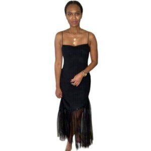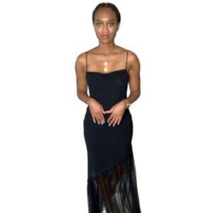 The combination of the plunging back, draped neckline, and mesh hem makes this dress a standout piece that effortlessly blends simplicity with sophistication.