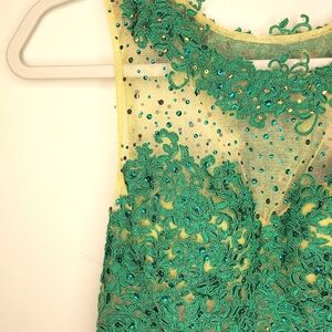 Dave & Johnny long, formal dress. Colors are Teal green and nude. Sleeveless, side hidden zipper, built in bra, fully lined, train. Size 3/4. Waist 13", hips 17", chest 15 1/2", chest does have some stretch to it. Lenght of front from center of breast to bottom 49", train in back is around additional 13". Worn once to prom. Slight signs of wear upon very close inspection. A few sequins have popped off, but the sequins are all in such a random pattern, you don't notice at all. Overall good pre-owned condition.