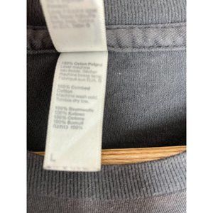 In good condition but does show wear, fading. Has some marks towards top at front and bottom. Maybe from sitting on a hanger so long? Not sure. Still a cool shirt. Tag says Large but looks to be on the smaller side maybe more like a medium.