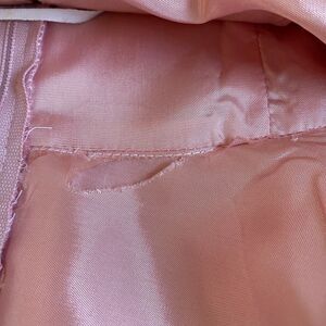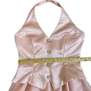 Brand: Dave and Johnny. This is vintage mini dress, halter neckline, front button, rhinestones, satin, fill gauze skirt, back zipper. Size: 12/13. Color: pink. Vintage, never worn condition. There’s mended hole on underskirt. It was left from magnet which I had to to cut off because it was old type of magnet containing ink.