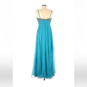 Aqua blue maxi dress with sweetheart neckline embellished with ruffles, sequins, beads, and rhinestones. Empire waistline, with back zip closure and thin chiffon straps. Bust has corset stays and is lightly padded. Skirt is satin, with flowy chiffon panel overlay. Some areas of light wear on lower chiffon panels, see last pics.