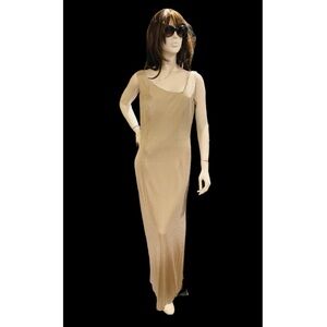 Elegant floor-length sheath dress is designed to make a statement with its luxurious pale gold hue and figure-flattering silhouette. The gown has sparkling rhinestone embellishments (none missing) that that beautifully outlines the neckline that is asymmetrical, front and back. Side zipper for a seamless fit, this gown is the choice for those who want to shine! Excellent condition, size 12. Top-rated seller, same-day shipping! Shop my closet for more trendy and vintage items to complement your style.