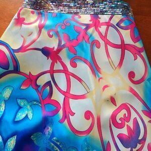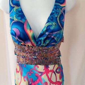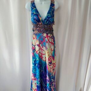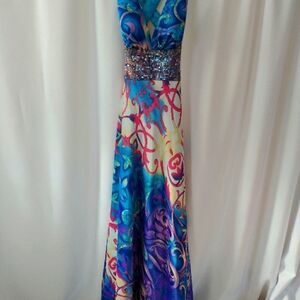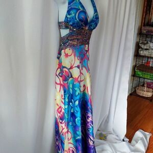 Stunning, beautiful long dress special occasion prom colorful sexy low with Cris cross straps low back small train fully lined in excellent used once condition. Size 3/4 measures flat 14" pit to pit approx. 65" long. Please let me know if you'd like more photos or info