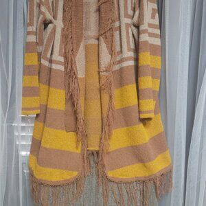 Cozy, bold, and boho-chic! This Davi & Dani open-front cardigan (1XL) features a beautiful geometric Southwestern-inspired pattern in warm tan, cream, and mustard tones. Finished with fringe trim, a draped waterfall front, and a soft, textured knit — perfect for layering in fall, winter, and cool spring days.