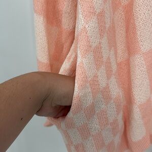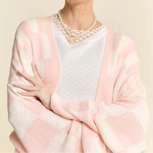 Gorgeous lightweight multi checkerboard print cardigan sweater in baby pink and white colors. Cardigan features side pockets!! 100% Acrylic.
