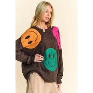 Davi & Dani Contrast Smile Round Neck Oversized Pullover Sweater | Dark Brown