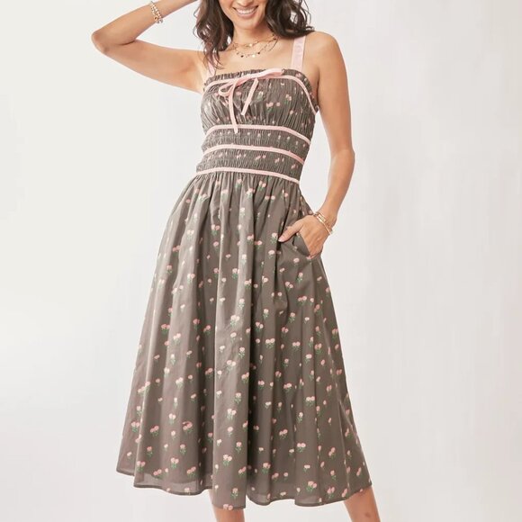 Davi & Dani Contrast Velvet Tape Smocking Bodice Midi Dress