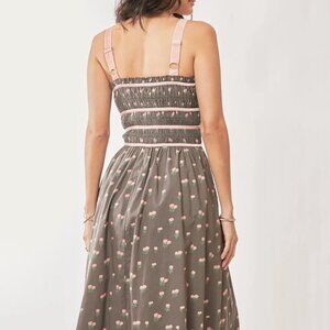 *This charming midi dress features a classic vintage-inspired design with a modern twist. Made from lightweight fabric with a delightful polka dot pattern in gray and cream. The smocked bodice provides both style and comfort, while the spaghetti straps add feminine elegance. The dress is enhanced with contrast trim detailing at the waist and neckline. The practical side pockets and midi length make it perfect for various occasions. The A-line silhouette creates a flattering fit suitable for different body types. Ideal for summer events, casual outings, or dressed up for special occasions.