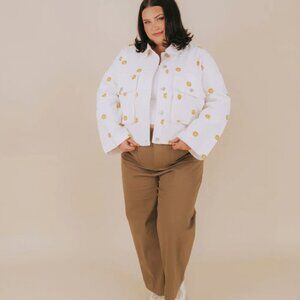 Fly high in style with our Learn To Fly Denim Jacket. Made with white denim and adorned with yellow embroidered daisies, this playful jacket is sure to turn heads. Featuring functioning buttons and front pockets, it's both fashionable and functional. Take off in this plus size jacket and feel confident in your own unique style.