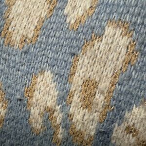 Touch of Shimmer with this Light Blue and Gold/Yellow and White Leopard print Cardigan. Two pockets. This is a fuzzy type exterior. You can use a sweater shaver but will still have the fuzzy look. Though can use a good shave. The gold/maize/yellow thread has shimmer.