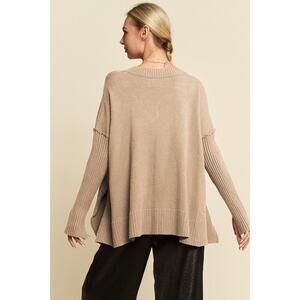Davi & Dani Ribbed Side Slit V-Neck Long Sleeves Oversized Sweater | Tan