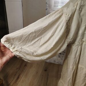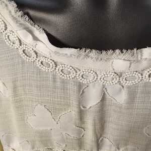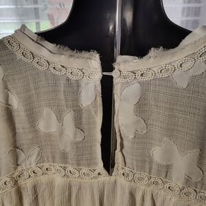 A very tiny hole shown in the picture. The Davi & Dani Top Women's Boho Lace Coquette Cottagecore Blouse in size 3X is a stylish and feminine piece perfect for any season. Made from ivory rayon with delicate lace fabric, this blouse features a round neck and short sleeves, offering a comfortable and trendy look. The boho, cottagecore style is complemented by a charming butterfly theme, adding a touch of whimsy to the overall design. Ideal for plus-size women, this blouse is a versatile and chic addition to any wardrobe.
