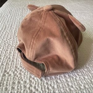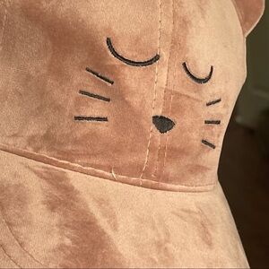 Cat ears and embroidery with kitty nose and whiskers cap hat, dust pink/pink color, velvet fabric super soft , baseball style adjustable Velcro strap at the back. Excellent condition, very clean, no odors/ stains,super cute.