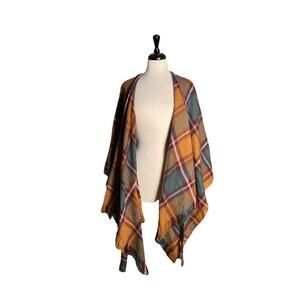 David And Young Plaid Pattern Belted Waist Fringe Open Front Poncho Tie Waist