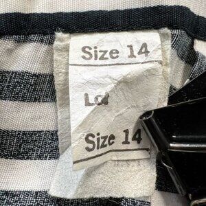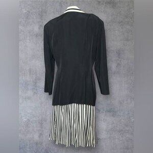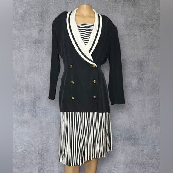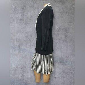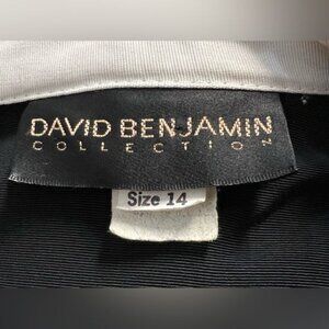 This David Benjamin Collection two-piece outfit features a tailored black double-breasted jacket with white lapel details and a matching black-and-white striped skirt. Crafted from a blend of rayon and acetate, this classic design offers a polished and versatile look for formal or semi-formal occasions. The set is size 14 and dry-clean-only for care.