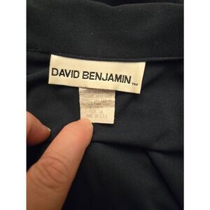 This vintage David Benjamin dress is a stunning addition to any wardrobe. The beautiful navy color and solid pattern make it perfect for any occasion, whether it be travel, Holy Communion, casual or business. The dress features short cap sleeves and a V-neckline with a zip closure.