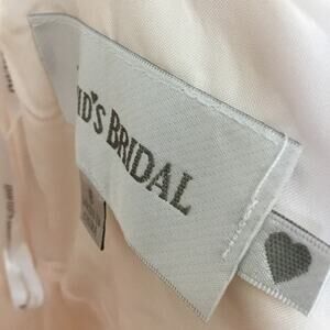 Sleeveless bodice features v-neckline and illusion lace straps with scalloped edging.