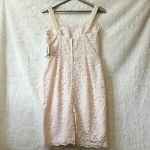 Sleeveless bodice features v-neckline and illusion lace straps with scalloped edging.